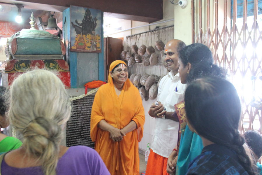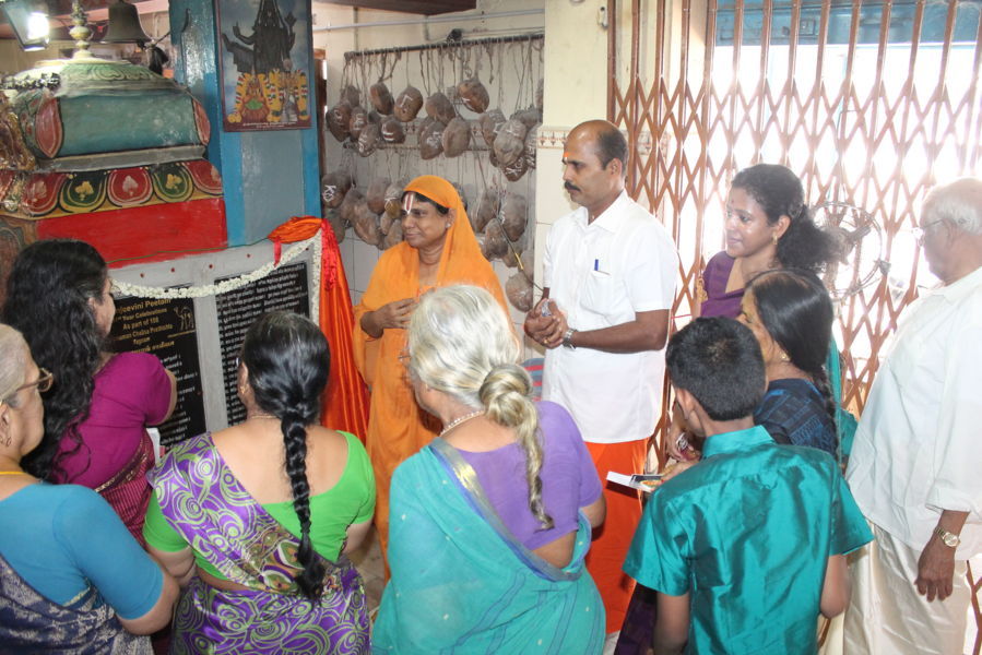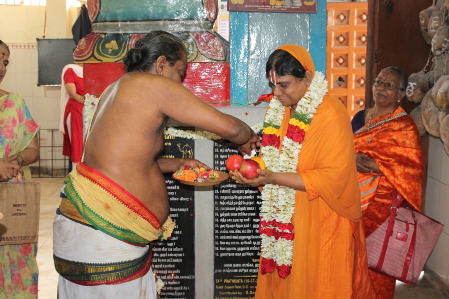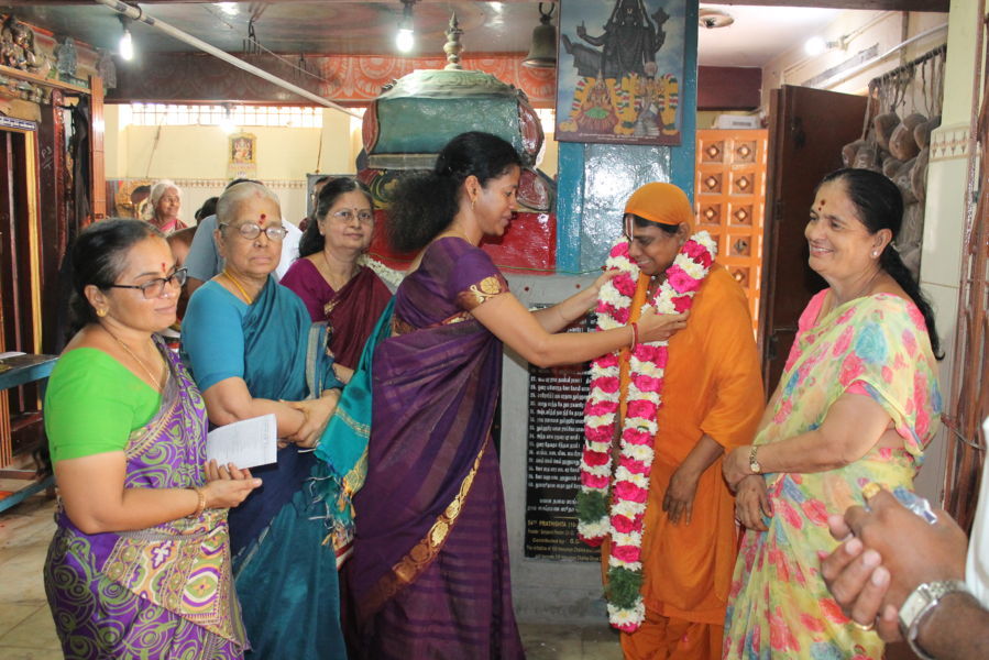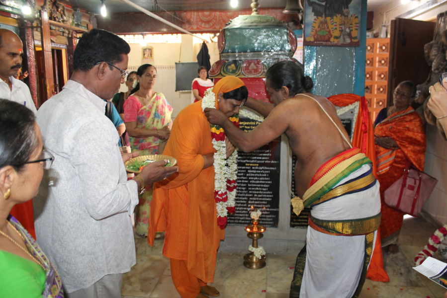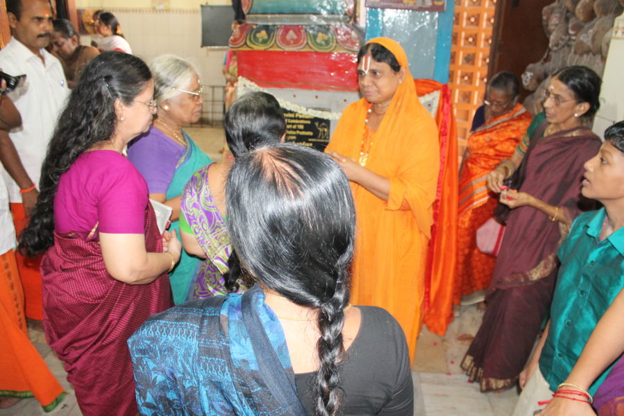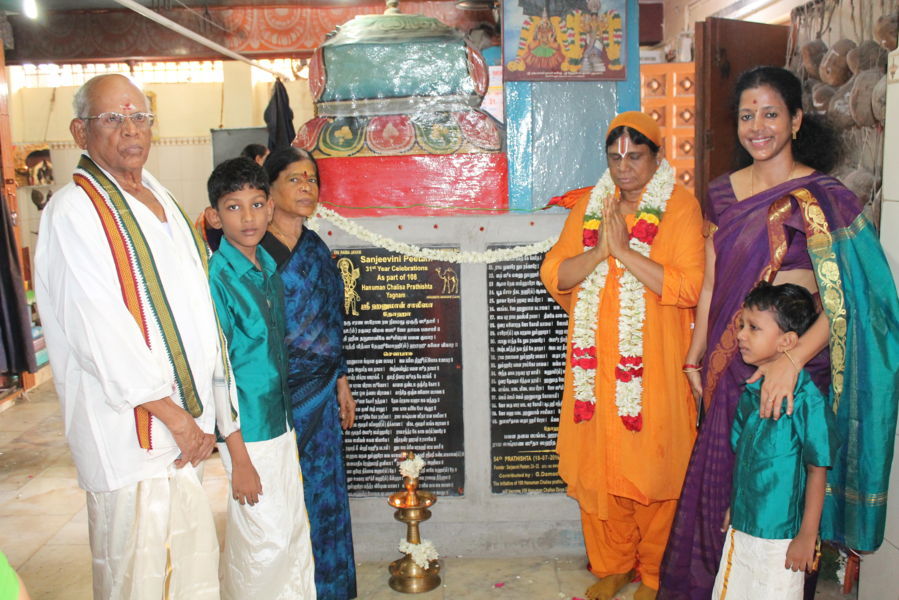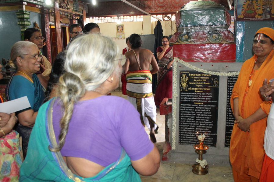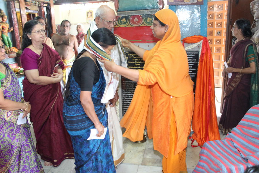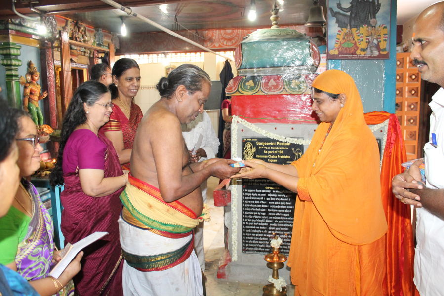 గుడి యాజమాన్యం, పూజారి  మాతాజీకి పూర్ణకుంభ స్వాగతం పలికి  ఆహ్వానించినారు . 54 ప్రాంతాలలో  హనుమాన్ చాలీసా శిలా పలకముల ప్రతిష్ట లను  దిగ్విజయముగా  నిర్వహించినందుకు , హనుమంతుని కృపతో జరిగినందుకు అందరికి కృతజ్ఞతలు  తెలియ చేసినారు .  మన సంస్కృతి  సంప్రదాయములు  తరువాత  రాబోయే తరం  వారికొరకు తప్పక  అందరూ  చాలీసా పారాయణాలు అన్ని దగ్గరలా  ఆచరించాలని , పిల్లలను  ప్రోత్సహించాలని  ఉద్బోధించారు .  ప్రతి  ఇల్లు  ఒక దేవాలయం  కావాలని , పిల్లలకు  నేర్పితేనే  భావి తరాలు బాగుపడతాయని , భారత దేశం  ఉజ్వలంగా  భాసిల్లుతుందని  ఆశించారు.  వారందరికీ  ఒక మారు  పారాయణ చేసి వినిపించారు .  ముఖ్యంగా  అన్ని దగ్గరలా చెబుతునట్టుగానే భగవత్ గీత గురించి క్లుప్తంగా  వివరించి ,  ఇకమీదట  ఆ  కోవెలలో  గీత పారాయణాలు  జరుగునటుల  అందరి దగ్గర  ప్రతిజ్ఞ  చేయించారు .  విరాళం  అందించిన  దామోదరం దంపతులను అభినందించి  ఆశీర్వదించారు .  భక్తులకు  సిందూరం  రక్షలు  స్వామి వారి ఫోటోలు  వితరణ చేశారు.