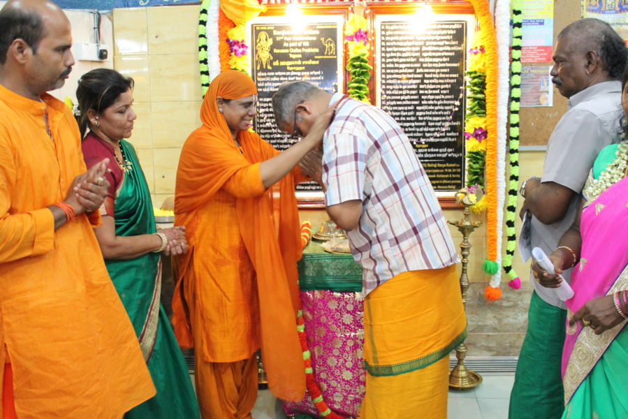 ‘with a loud voice. then i also felt joyful and started the nama, and was immersed in the chanting. I was not in this world. Mrs.Premi maam mesmerised all the people for one hour with this holy chanting of mantra. I was not aware of this time. To their shock, i could not lift my legs as they became very heavy. All were thinkilng how to come out of this,then suddenly venuji started bhajan saying that ‘Anjaneya veera, hanumanth soora, vayu kumara, vanara veera’ Hearing this i started dancing it seems. After that when i came to know all this , i asked them what is that made them to do all this without my knowledge. I said that i you have done this to me, i will be debted to u till the next birth and i feel that i have to wash all your feet. For this , they answered that they were inspired the activities of hanuman mathaji uploaded in fb, youtube, peetham website and decided to perform this. They also said that it is not the pada pooja for the materialistic body, but the omnipresence of Lord hanuman in you mathaji. I was inspired by their answer. Then immediately i started the satsang on 16-09-2016. I got hurt on my head when i was walking fast in batu caves. The blood was oozing out and my shawl became wet. My entire face was with blood. Everyone was very scary seeing my face. But miraculously i didnot feel any pain,